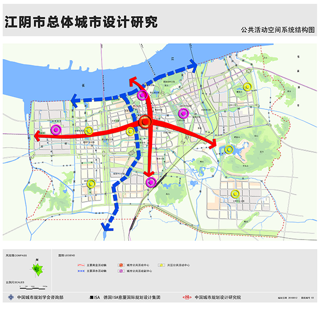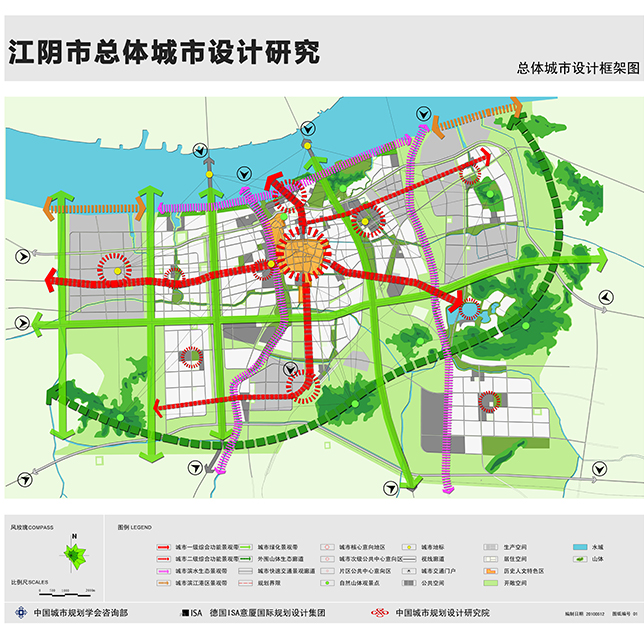 江阴总体城市设计以江阴市总体规划为依据,针对江阴市197平方公里市域面积进行总体城市设计引导性规划。在本次城市设计项目中,以Prof.Dr. Ing. Michael Trieb教授城市设计理论体系为指导针对江阴市城市设计元素进行逐一梳理,并通过建立3维模型及城市建筑、公共空间数据库,对江阴市城市设计元素进行总体模拟及规划演示。通过对江阴市公共空间体系、绿化体系、水体系和视觉景观体系等进行充分研究,总体城市设计以以分层次、分系统、分区块,逐次深人、逐步落实相关内容,作为总体城市设计的工作方法。首先通过相关规划梳理、相似案例研究、发展条件分析等一系列相关方面的研究,结合公众参与,寻求具有独特性、认同感与凝聚力的特色风貌定位,明确发展目标;继而通过整体性和系统性的设计控制,整合与优化城市环境及各个系统,来强化城市形象特征,提升城市环境的质量;最后在系统架构的基础上,以通则或者导则的形式制定出相应的控制策略和设计指导原则。