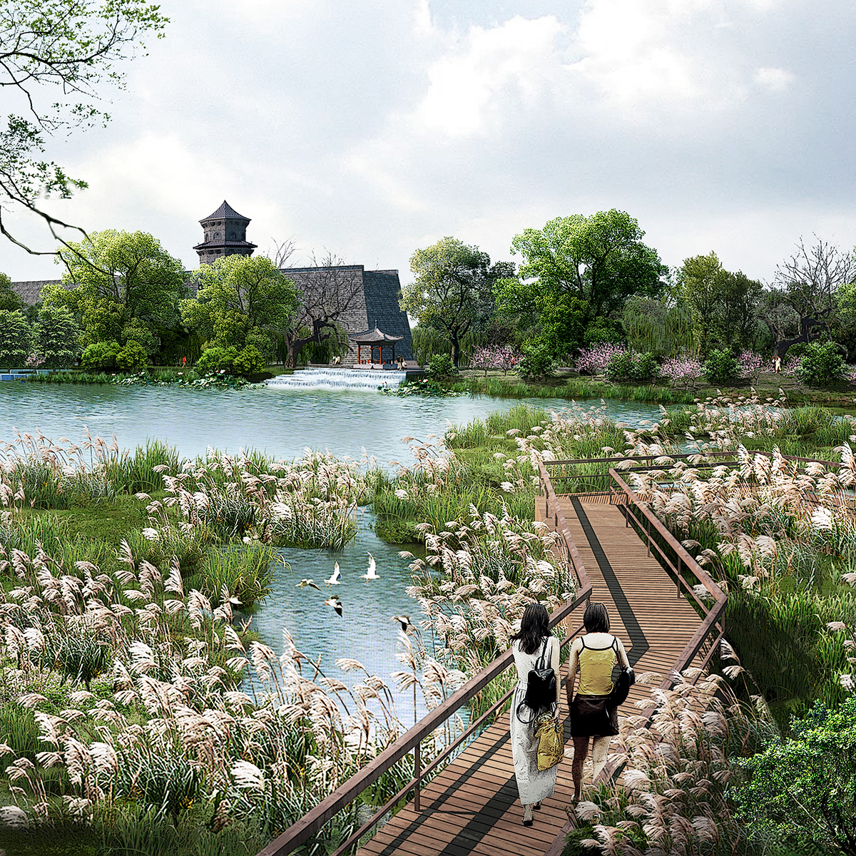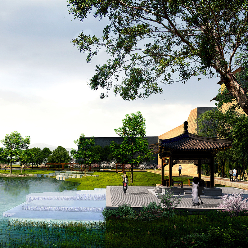方案利用金牛湖人工湖体土方量堆砌小山,此手法也属于传统园林石景设计之一。堆山材料主要为石、土相间的池山,经过独具匠心的营造,兼备自然的形神外还具有传情的作用。