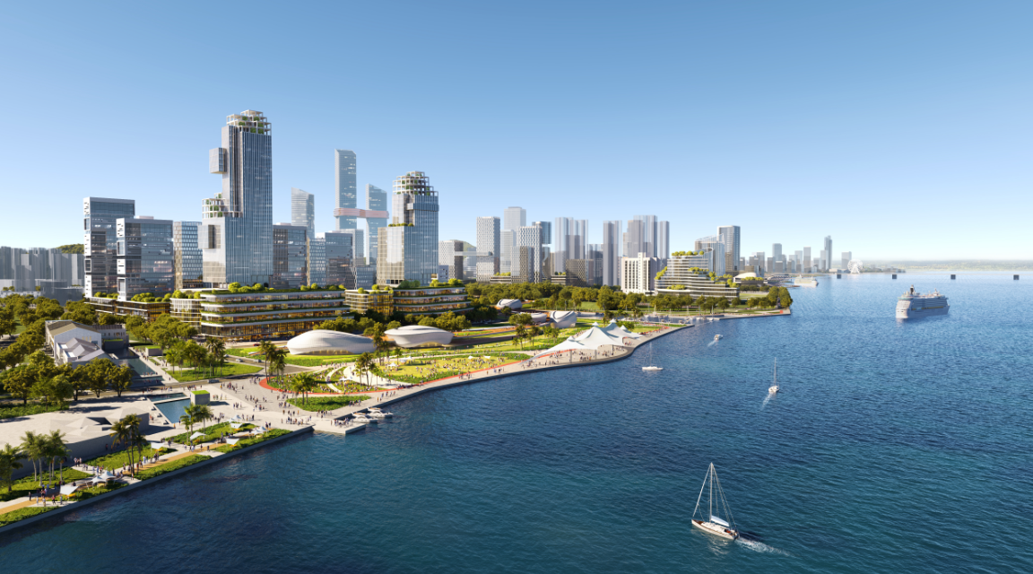 规划依托现状河涌、景观廊道、滨海空间,新增一系列具有高辨识度的海港门户地标,同时构建通山达海的城市漫游路径。其中,将20公里共享活力径划分为多功能滨海漫步主题区,为居民和游客提供良好生活与旅游体验。设计方案基于邮轮母港,塑造鹿颈涌滨河CAZ中央活力区,实现双核联动;基于国家重点项目与科创教设施集群,打造科技引领、便捷高效、智汇未来的科创园区,为院士科学家提供工作生活服务,并布局精致科创合院,加强并实现邻里共享。片区风貌整体以象牙白及明黄为主导色彩,汲取海洋生态元素和岭南传统元素,展现一个融汇岭南风韵的现代海洋新城。