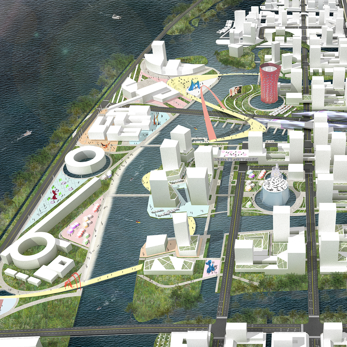 深圳海洋新城项目是我们对与海共生理念的一次综合实践,作为深圳市继前海后获得的一个稀缺战略性发展空间,项目对城市开发强度、体量及功能都提出了很高的要求,但另一方面,由于基地位于深圳大空港地区西北部,珠江河口围填地区,整个城市设计工作必须在截留河和生态湿地等多种设定下完成,导致任务书中将如何生态用海、生态营城、发展海洋产业列为三大核心议题。在给出的城市设计解决方案中,我们将人海共生设定为整个设计的出发点,在借鉴学习全世界案例的成功经验下,试图通过人为适度干预+生态自然修复两种相互结合的方式协调城市、海洋、生态三者之间的关系,最终塑造一种与自然共生、与海洋共生的新型海洋新城。