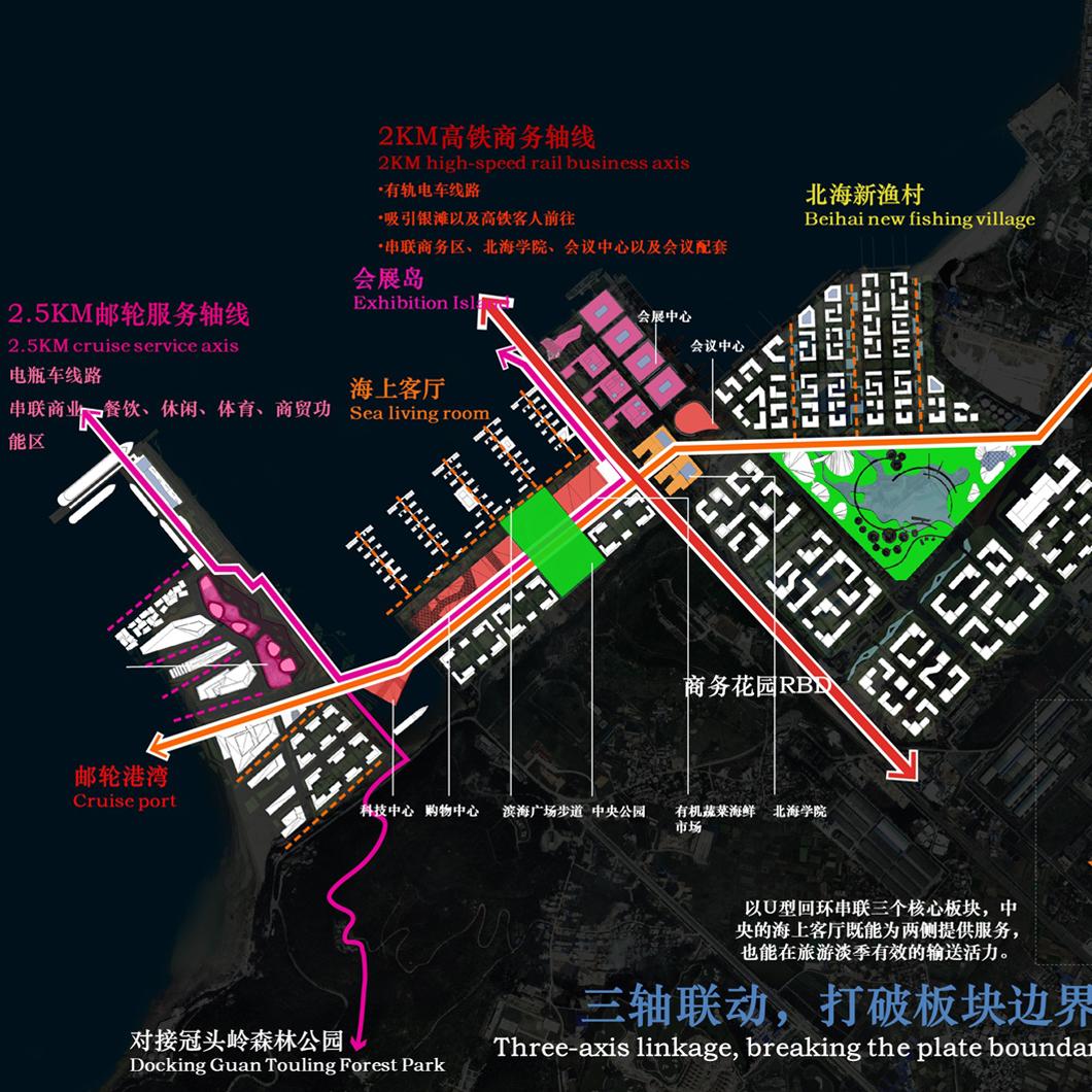 商务服务:依托交通枢纽及北海的产业优势,建立专业会展中心、会议中心、滨水企业公馆、商务花园等高端商务服务聚集区。