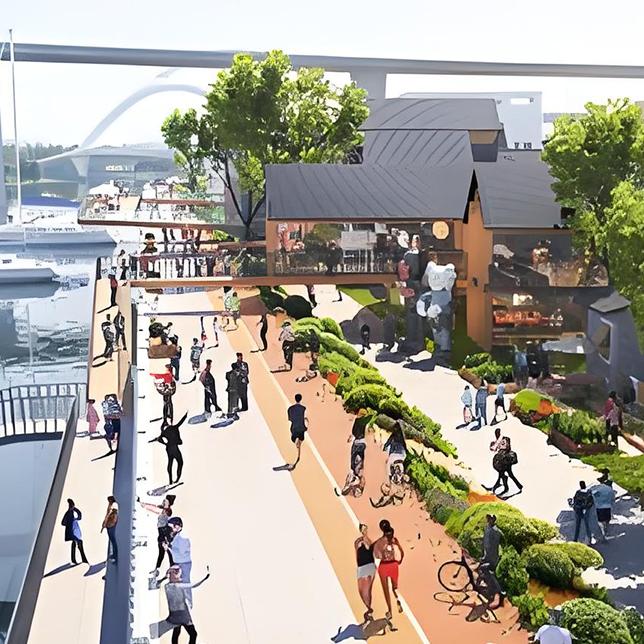设计以贯通滨水公共空间与环岛路交通为基础,构建便捷连贯的滨水通行体系;结合现状空间独特的工业风貌气质与滨水区域开发潜力,塑造集文化、生态与功能于一体的多元复合滨水界面;并通过设置一条贯穿该多功能界面的连续慢行通道,强化滨水区连通性与体验感,实现人与水的深度互动与空间融合。