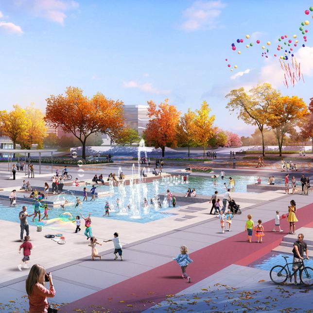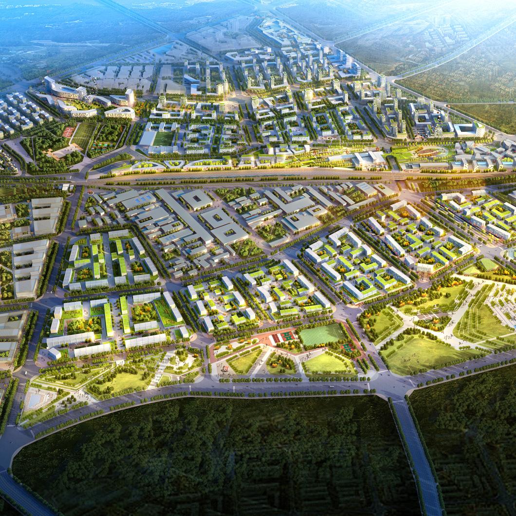铁路沿线布局低密度商业街区和文化展示交流中心。规划采用开放式的建筑布局,通过可渗透的街区布局形式营造多样变化的公共空间,融合休闲、购物、艺术、户外展览、市民广场等元素,打造一个充满活力的商业购物与文化展示街区。