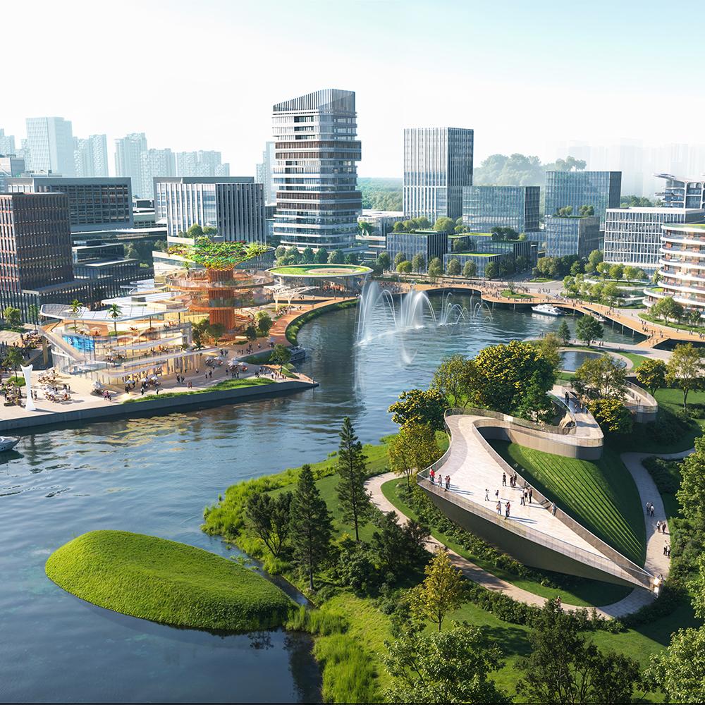 方案将泉州滨海活力岸线向内陆延展,以现状坑塘肌理为本底,建立城市空间网络;湖心绿洲联动东侧海丝艺术公园,塑造百崎湖绿色活力休闲客厅;两条城市服务廊道串联起三岛一洲,协同发展,交叉赋能;设计融入古城“锦鲤”文化元素,将锦鲤游曳的灵动姿态,转译为路径、岸线、岛屿的有机轮廓,承载未来泉州的城市活力与自然生机。