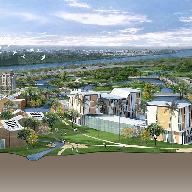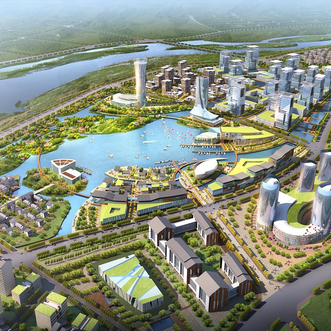 围绕活力水脉与文化动圈,融入城市日常生活,一体化塑造滨河生活、工作、休闲体验:滨水商务办公+滨水高端公寓+田园健康社区。